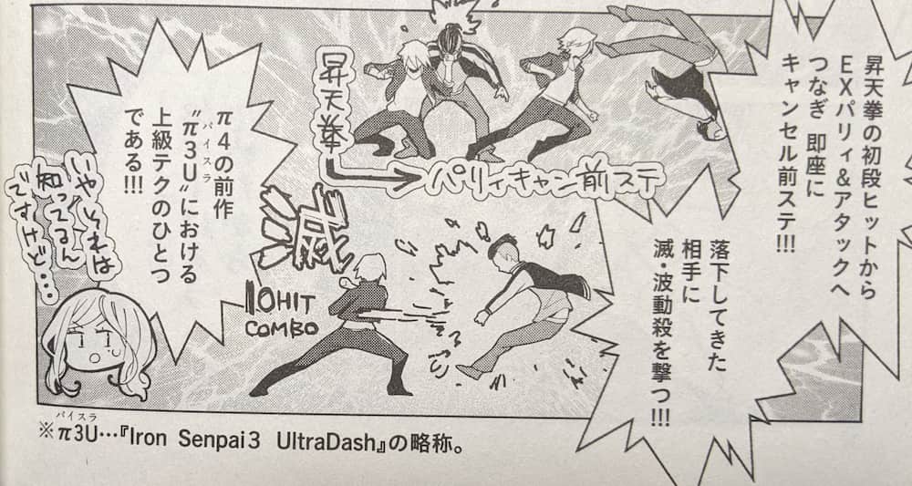 本作では既存の格ゲーでは無くπ4(Iron Senpai4)という作品独自の格ゲーが出てくるんだけど、こういう作りも結構面白い。僕自身ゲーム自体は好きでよくやるんだけど、格ゲーはあまりやらないので詳しくは無い。