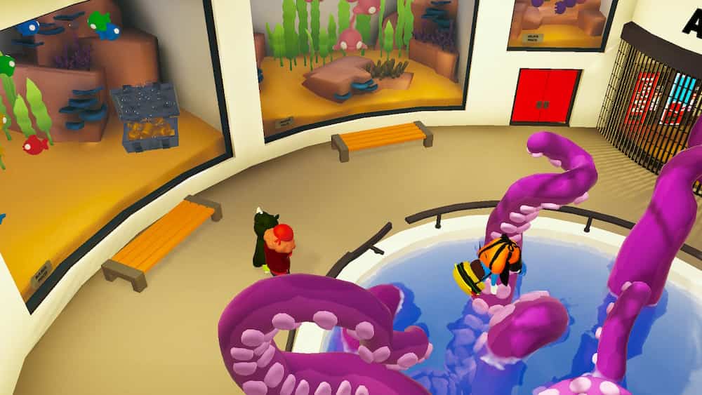 特に水族館のステージはマップ中央から触手が伸びてきてプレイヤーを水中に引きずり込んできたりするし、動く列車の上ステージでは油断していると標識が通り過ぎて振り落とされたりと割とパターンが豊富で色々と楽しめる。